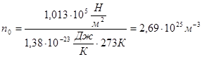 Р = 1 атм, Т=273К, Vμ=22,42 x 10-3 м3/моль, 1атм = 1,013х105 Н/м2.