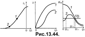 Виконання умов збудження та усталення коливань залежить від початкового положення робочої точки на ВАХ нелінійного елемента. Наприклад, на Рис. 13.44, ліворуч подано прохідну характеристику транзистора із схеми автогенератора, зображеної на Рис. 13.41. На ній позначено дві робочі точки, 1 та 2, які можуть бути одержані шляхом подавання відповідної сталої напруги на заслін транзистора. На середньому графіку Рис. 13.44 подано залежності амплітуд першої гармоніки струму для цих двох робочих точок, а на правому графіку - середні коефіцієнти підсилення для цих випадків. На цьому ж графіку подано пряму