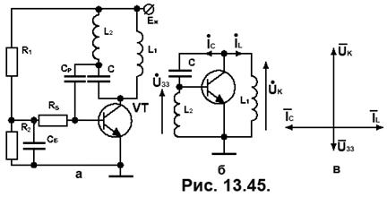 знімається напруга зворотного зв’язку, що діє на вході транзистора. Коливальний контур LC, який є навантаженням підсилювача, ввімкнено у колекторне коло транзистора, тобто схема підсилювача є інвертувальною. Внаслідок цього фаза вихідного коливання відрізняється від фази вхідного на 180 градусів. Ця умова виконується тільки на резонансній частоті контуру, де його опір є активним. На Рис. 13,45,в подано векторну діаграму струмів і напруг у коливальному контурі за умови нехтування його активними втратами. Як видно з діаграми, напруга на