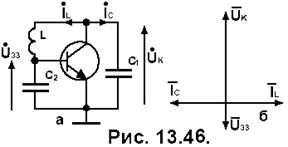 Таким же чином працює ємнісна триточка, еквівалентну схему якої подано на Рис. 13,46, а, а векторну діаграму – на Рис. 13.46,б. Тут напруга ЗЗ знімається з ємності