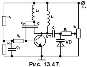 У випадку, коли необхідно керувати частотою коливання (наприклад, під час модуляціїї), основним способом зміни частоти генерації є використання змінної ємності варикапа VD, підімкненого до коливального контуру генератора. Схему електричного керування частотою генератора подано на Рис. 13.47. Щоб не втрачати крутість керування, виконується умова
