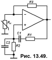 Найбільш поширеною схемою RC генератора з колом Віна є схема на операційному підсилювачі з нелінійним колом від’ємного зворотного зв’язку, подана на Рис. 13.49. Під час збудження співіддношення між опорами від’ємного зворотного зв’язку таке