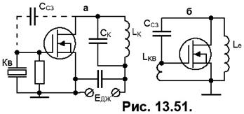 має індуктивний характер. Разом з паразитною ємністю сток-заслін транзистора утворюється індуктивна триточка, еквівалентну схему якої подано на Рис. 13.51,б. На Рис. 13.52,а подано схему генератора, де кварцовий резонатор працює на частоті