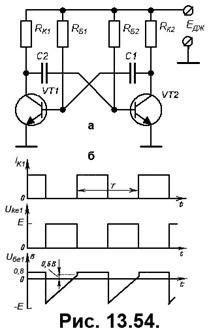 Після закінчення перезаряду С2, під час відкривання транзистора VT2 його колекторна напруга швидко спадає, що, через конденсатор С1 передається на на базу VT1. Останній переходить у активний режим. При цьому виникає процес швидкого перемикання схеми з одного квазістійкого стану у інший, під час якого VT1 знаходиться у режимі відсіканняя, а VT2 – у режимі насичення. На Рис. 13.54,б наведено часові залежності колекторного струму і напруг на електродах VT1 без урахування процесу заряду конденсатора С1. Аналогічні залежності для транзистора VT2 мають такий же вигляд, але зсунуті у часі на півперіода коливання.