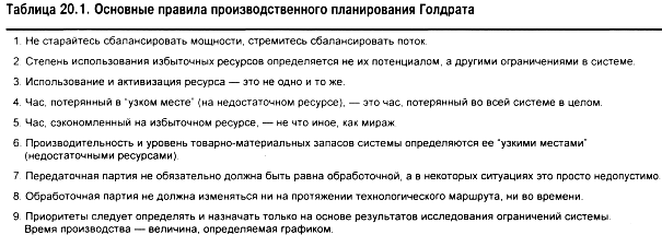 Эта программа получила название технология оптимизированного производства (Optimized Production Technology — ОРТ). Составленные по ней графики выполнимы и точны, и их можно запускать в компьютере частями, т.е. по временным периодам, на которых основана работа MRP-системы. Все это стало возможным благодаря тому, что логика составления графиков основывалась на разграничении операций, выполняемых в "узких местах" производственной цепочки (иначе говоря, на недостаточных ресурсах) и на избыточных ресурсах производственного потока. Для упрощения понимания логики составления графиков методом ОРТ д-р Голдрат приводит девять основных правил производственного планирования (табл. 20.1).