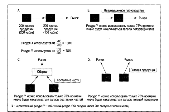 Четыре описанные выше ситуации демонстрируют характеристики недостаточных и избыточных ресурсов и их взаимосвязь с производством и рыночным спросом. Они показывают, что практика применения в промышленности уровня загрузки ресурсов в качестве критерия эффективности способна приводить к чрезмерной загрузке недостаточных ресурсов и, как результат, к наращиванию избыточных товарно-материальных запасов.