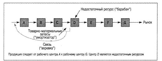 Предположим, что обрабатывающий центр D — недостаточный ресурс. Это означает, что операции как до этого ресурса, так и после него имеют большую мощность. Если такой последовательностью не управлять, то скорее всего перед рабочим центром D соберется большой запас деталей, а на последующих участках их будет недостаточно. Запасы готовой продукции будут очень небольшими, поскольку (исходя из определения недостаточного ресурса) вся выпушенная продукция будет направляться на рынок.