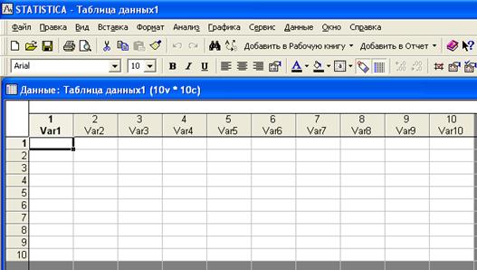 У пакеті STATISTICA дані, отримані в результаті експерименту зручно зберігати у вигляді таблиці, в якій стовпці відповідають показникам, які спостерігають (випадковим величинам), а рядки – окремим спостереженням (випадкам). При завантаженні пакета програм STATISTICA та при створенні нового файлу з’являється електронна таблиця, в заголовках якої вказані назви 10 змінних–стовпців (Variables) по 10 спостережень (Cases).