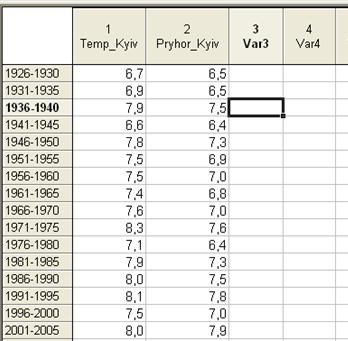 Побудуємо описові (дескриптивні) статистики для аналізу статистичних даних, що містяться в таблиці Temp.sta, яка містить дані про середньорічну температуру в Києві та його пригородах за період з 1926 по 2010 р.