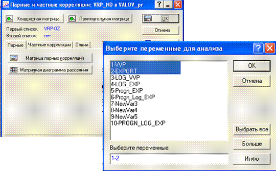Натиснемо на кнопку Матрица парных корреляций та оберемо змінні для аналізу.