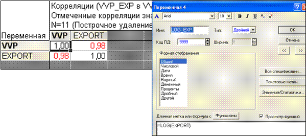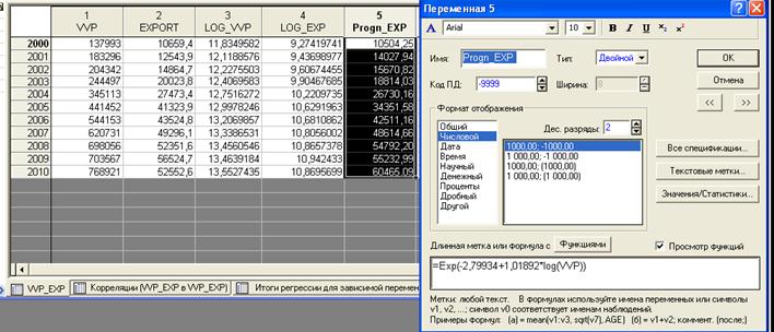 Щоб стабілізувати дисперсію змінних VVP та EXPORT та зменшити величину похибок, використаємо логарифмування. Для цього введемо додаткові змінні Log_VVP=LOG(VVP) і LOG_EXP=LOG(EXPORT).