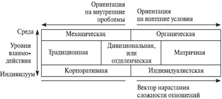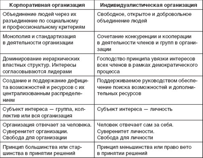 использованием формальных правил и децентрализацией в управлении. Гибкая структура такой организации позволяет ей быстрее адаптироваться к изменениям внешней среды. Вместо системы формального контроля доминирует самоорга-низация. Специфика взаимодействия организации и индивидуума порождает два основных типа организаций – корпоративные и индивидуалистские.