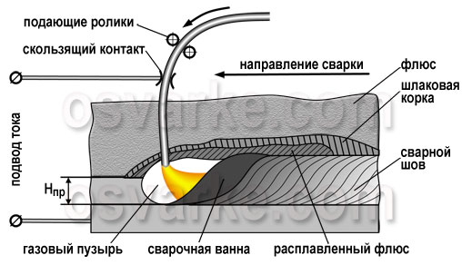 Проволока подается в зону сварки с помощью подающих роликов. Подвод тока к проволоке осуществляется скользящим контактом. Плотный слой флюса, высыпаемый из бункера во время движения сварочного автомата, обеспечивает эффективную защиту расплавленного металла сварочной ванны от взаимодействия с воздухом. Дуга горит в газовом пузыре, который образуется парами и газами флюса и расплавленного металла. В результате металлургического взаимодействия шлака и расплавленного металла и кристаллизации металла сварочной ванны формируется шов с необходимым химическим составом и механическими свойствами. На поверхности шва располагается легко отделяемая шлаковая корка из затвердевшего флюса. Не израсходованный флюс собирается во флюсоаппарат для дальнейшего применения при сварке.
