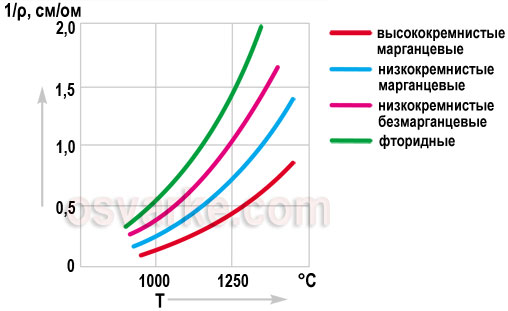 На приведенном ниже графике видно, что наибольшей электропроводностью обладают фторидные флюсы. Они обеспечивают наилучшую устойчивость процесса электрошлаковой сварки, но получили ограниченное применение (например, для сварки высоколегированных аустенитных сталей) из-за необходимости в низком напряжении сварки, что затрудняет получение требуемого провара кромок.
