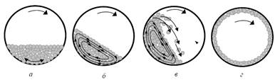 Рис. 4. Схема движения шаров в барабане шаровой мельницы при различной скорости его вращения: а – режим скольжения при n ≤ 0,2nкр; б – режим перекатывания при n ≤ 0,4–0,6nкр; в – режим интенсивного измельчения (водопадный режим) при n ≤ 0,75–0,85nкр; г – движение шаров при n ≥ nкр.