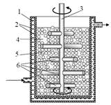 Рис. 5. Схема аттритора: 1 – корпус мельницы (размольная емкость); 2 – водоохлаждаемые стенки корпуса мельницы; 3 – вал мешалки аттритора; 4 – измельчаемый материал; 5 – размольные тела; 6 – лопасти мешалки