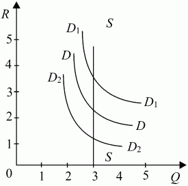 Кривая D показывает спрос на землю, a S – предложение земли. Предложение земли абсолютно неэластично, так как ее количество всегда одинаково и не может быть изменено. Поскольку предложение фактически фиксировано, то единственным решающим фактором, определяющим ренту, может выступать только спрос на землю. Он зависит от цены продукции, которую можно производить на конкретной земле, от производительности самой земли. Точки, которые устанавливают размеры ренты, лежат на пересечении кривых спроса с кривой предложения. При средней величине спроса (кривая D) рента устанавливается примерно на уровне трех денежных единиц (точка R). При увеличении спроса и смещении кривой спроса до уровня рента будет равна 3,7 денежных единиц. При уменьшении спроса и сдвиге кривой до уровня D1 рента составит 1,8 денежных единиц. Изменение величины экономической ренты не окажет никакого влияния на количество предлагаемой земли, т. е. цена в данном случае не будет выполнять функцию стимулятора предложения. Продавая землю, ее собственник теряет ежегодно получаемый им доход – экономическую ренту. Поэтому в обычных условиях он согласится продать землю только за такую сумму, которая, будучи положенной в банк, будет приносить ему доход в виде процента, который будет не меньше получаемой ранее ренты.