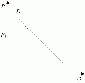 Если цена за единицу товара А составит P1, то кривая на них будет изображена в виде горизонтальной линии D. Эта кривая показывает, что любое количество предлагаемого товара А будет продаваться по цене Р1. Однако графическое изображение рыночного спроса на товар А будет иметь вид наклонной линии D, которая показывает готовность потребителей приобрести различное количество товара A при всех возможных уровнях цен (рис. 9.2). При цене Р1 товара A будет приобретено в количестве Q1.