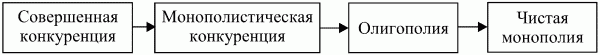 Фирмы постоянно действуют в условиях конкуренции. Решения о цене и объеме производства у различных покупателей будут существенно различаться в условиях различных типов рыночных структур. Термин «конкуренция» используется для обозначения типа рыночной структуры. В зависимости от степени убывания конкуренции выделяют четыре основных типа рыночных структур (или моделей) рынка, а именно: чистую (совершенную) конкуренцию, монополистическую конкуренцию, олигополию, чистую монополию.