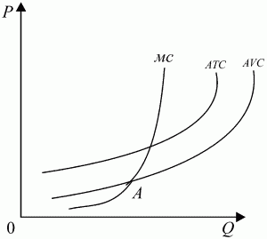 Каково же будет поведение конкурентной фирмы в краткосрочном периоде, если фирма встанет перед выбором – прекращать производство или производить некоторое количество продукции? В краткосрочном периоде конкурентная фирма может работать с убытками, поскольку рассчитывает получить прибыль в будущем. Каково же условие прекращения производства? Для того чтобы ответить на этот вопрос, необходимо проанализировать соотношение цены (Р) и средних переменных издержек (AVC). Если цена окажется выше средних переменных издержек, то соответственно доход, приносимый каждой единицей выпуска, будет полностью покрывать переменные издержки и частично постоянные. Однако постоянные издержки должны покрываться всегда: и когда продукция выпускается, и когда ее выпуск приостановлен. Поэтому возникает необходимость продолжать производство для их частичной оплаты. В случае если цена окажется ниже средних переменных издержек, то как постоянные, так и переменные издержки не смогут оплачиваться полностью. В данной ситуации производство продукции целесообразнее приостановить. Однако это не означает полного закрытия производства. Но если фирма в состоянии оплачивать постоянные издержки, то она может оставаться на рынке и продолжать производство в случае повышения цен. Конечно, некоторые фирмы, не выдержав столь жесткого положения долго, вынуждены будут покинуть отрасль. Если представить данную ситуацию графически, то точкой ухода фирмы с рынка будет точка А (рис. 9.6).