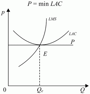 В долгосрочном периоде экономическая прибыль совершенно конкурентной фирмы может быть равна нулю. Почему? В долгосрочном периоде число фирм на рынке может измениться в результате прихода в отрасль одних фирм и ухода других. Как уже отмечалось, происходит это из-за отсутствия каких-либо барьеров. Однако процесс входа на рынок и выхода из него может прекратиться. Причиной этому может стать отсутствие экономической прибыли (рис. 9.7). Экономическая прибыль будет отсутствовать в том случае, если цена совпадет с минимумом долгосрочных средних издержек (LAC):