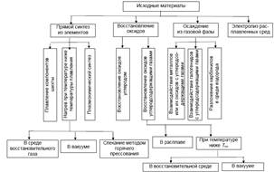 Методы получения порошков карбидов. В зависимости от требований, предъявляемых к карбидам в отношении состава, содержания примесей, стоимости, применяют тот или иной метод их получения. К основным методам получения карбидов относятся (рис. 14): прямой синтез из элементов; восстановление оксидов металлов углеродом с одновременной карбидизацией; плазмохимический метод; осаждение из газовой фазы.