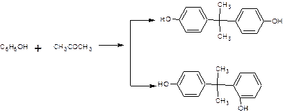 1. Конденсация фенола ацетном в присутствии серной и соляной кислоты или же хлористого водорода, что дает более чистый продукт