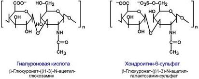 Дисахариды включают в себя какую-либо уроновую кислоту и аминосахар. Многократно дублируясь, дисахариды образуют олиго- и полисахаридные цепи – гликаны. Для углеводной части встречаются другие названия – кислые гетерополисахариды (т.к. имеют много кислотных групп), гликозаминогликаны (содержат аминогруппы). Основными представителями гликозаминогликанов являются гиалуроновая кислота, хондроитинсульфаты, кератансульфаты и дерматансульфаты, гепарин. Эти молекулы входят в состав протеогликанов, функцией которых является заполнение межклеточного пространства и удержание здесь воды, также они выступают как смазочный и структурный компонент суставов и других тканевых структур.