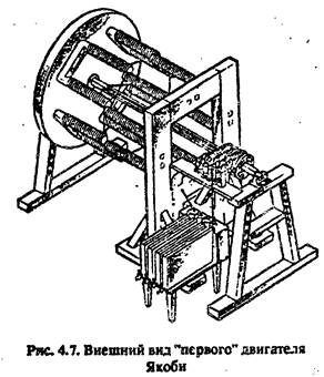 В 1834 г. Б. С. Якоби построил электродвигатель, работающий на принципе притяжения и отталкивания между электрическими магнитами. Двигатель имел две группы П-образных электромагнитов, из которых одна (4 пары) располагалась на неподвижной раме, а другая, аналогичная, - на вращающемся диске. Источником питания служила батарея гальванических элементов. Для изменения полярности подвижных электрических магнитов применялся специально разработанный коммутатор, который 8 раз за оборот изменял полярность тока в катушках подвижных электрических магнитов. Мощность подобного двигателя составляла примерно 15 Вт.