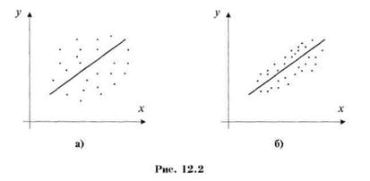 На рисунке 1.1 приведены две корреляционные зависимости переменной у от х. Очевидно, что в случае а) зависимость между переменными менее тесная и коэффициент корреляции должен быть меньше, чем в случае б), так как точки корреляционного поля а) дальше отстоят от линии регрессии, чем точки поля б).