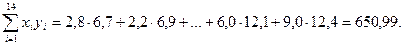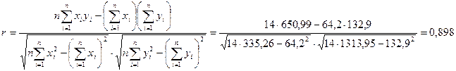 Пример. Найти коэффициент корреляции между производительностью труда у (тыс. руб.) и энерговооруженностью труда х (кВт) (в расчете на одного работающего) для 14 предприятий региона по следующим данным:
