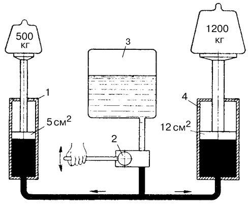 Система состоит из двух цилиндров 1 и 4 с разными площадями поршней, нагруженных грузами, и ручного насоса 2, выходной канал которого связан с цилиндрами, а входной – с резервуаром 3. При условии, что площадь поршня цилиндра 1 равна 5 см2 и цилиндра 4 – 12 см2 массы удерживаемых грузов при давлении жидкости, развиваемыми насосом в 100 кГс/см2, соответственно будут равны