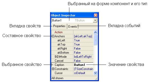 Компонент — на форме, пора задать его свойства. Для этого обратимся к окну с заголовком Object Inspector — окну свойств (рисунок 1.11). Оно расположено слева снизу от формы и активизируется с клавиатуры нажатием клавиши F11.