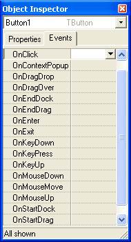 Нетрудно заметить, что окно Object Inspector состоит из двух вкладок: вкладки свойств — Properties и вкладки событий — Events. На вкладке Properties устанавливаются свойства компонента. Когда значения свойств определены, нужно активизировать вкладку Events. Вы тут же увидите список событий, на которые данный компонент может реагировать. В качестве примера приведем список событий, на которые может реагировать кнопка (рисунок 1.12):