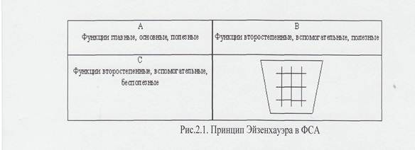 На Ш-ем, аналитическом этапе, подробно изучаются функции изделия (их состав, степень полезности), его стоимость и возможности ее уменьшения путем отсечения второстепенных и бесполезных функций. Это могут быть не только технические, но и органолептические, эстетические и др. функции изделия или его деталей, узлов. Для этого целесообразно использовать принцип Эйзенхауэра - принцип ABC (рис. 2.1).