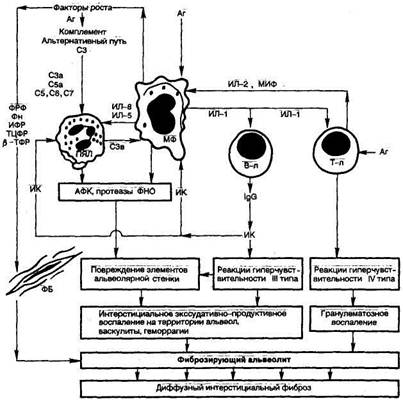 Важная роль в морфогенезе альвеолита отводится альвеолярным макрофагам и полиморфно-ядерным лейкоцитам, появляющимся первыми в альвеолах и призванным оказывать защитное действие. Однако в активированном состоянии эти клетки генерируют большое количество активных форм кислорода, протеаз, а также цитокинов, вызывающих повреждение и склероз легочной паренхимы.
