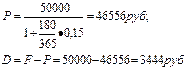 Определить, какую сумму (P) получит должник и сумму дисконта (D), если через 180 дней с момента подписания контракта должник уплатит 50000 руб., кредит предоставлен под 15% годовых по схеме простых процентов и при условии, что временная база равна 365 дням.