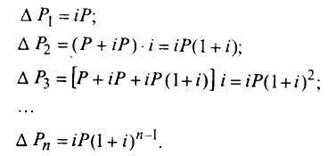 Сложные проценты. Рассмотрим более сложный случай с учетом капитализации процентов. Тогда имеем наращиваемую сумму Р переменной в зависимости от временного периода, так что за i-й период Р увеличивается на ∆Рj: