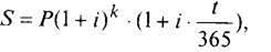 Если п представляет собой нецелое число, например п = k + t (k - количество целых лет, t - количество дней), то для вычисления наращенной суммы S используется выражение