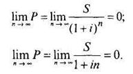 Если количество лет (n) будет достаточно большим, то современная величина любой суммы, вычисленная как по простым, так и по сложным процентам, будет стремиться к нулю:
