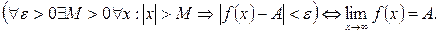 , если для любого положительного числа ε существует такое число М = М (ε) > 0, что при всех х,удовлетворяющих неравенству | х | > М выполняется неравенство