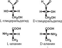 Различия связаны со взаимным расположением четырех замещающих групп, находящихся в вершинах воображаемого тетраэдра. Как известно, тетраэдр – это довольно жесткая структура, в которой невозможно произвольным образом передвинуть вершины. Точно так же для молекул, построенных на основе атома углерода. За эталон конфигурации принята структура молекулы глицеральдегида, установленная с помощью рентгеноструктурного анализа. Принято, что в качестве маркера используют наиболее сильно окисленный атом углерода, связанный с асимметричным атомом углерода (на схемах его располагают сверху). Таким атомом в молекуле глицеральдегида служит альдегидная группа, для аланина маркерной является СООН‑группа. Атом водорода располагают так же, как в глицеральдегиде.