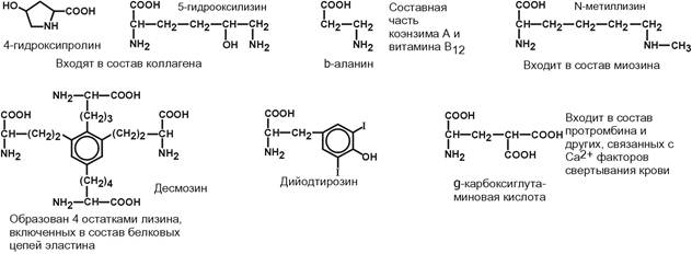 Кроме указанных, существуют и другие аминокислоты, обнаруживаемые в составе белков. В процессе синтеза белков они не участвуют, а синтезируются из протеиногенных аминокислот, уже находящихся в составе белковой цепи. Это нестандартные аминокислоты.