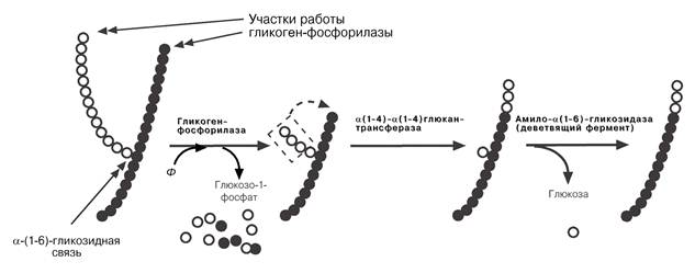 1. Фосфорилаза гликогена – расщепляет α‑1‑4‑гликозидные связи с образованием глюкозо‑1‑фосфата. Фермент работает до тех пор, пока до точки ветвления α(1‑6) не останется 4 остатка глюкозы.
