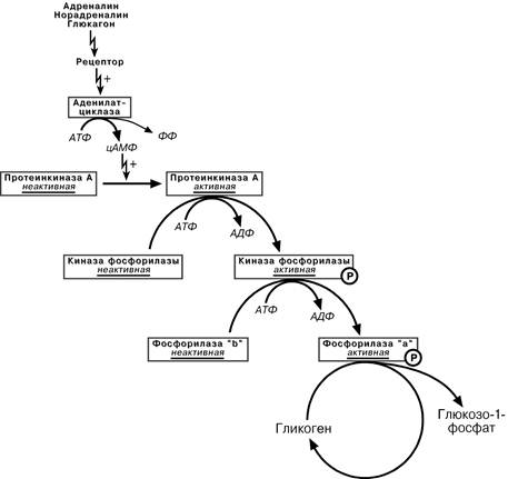 Происходит фосфорилирование фермента при действии гормонов на клетку через аденилатциклазный механизм. Он является так называемым каскадным регулированием: