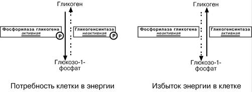 Ферменты метаболизма гликогена активны либо в фосфорилированной, либо в дефосфорилированной форме: