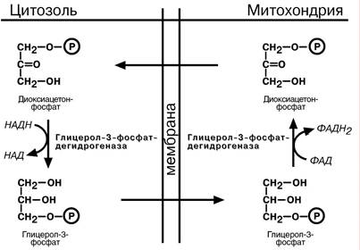 Метаболиты гликолиза – диоксиацетонфосфат и НАДН образуют глицерол-3-фосфат, поступающий в матрикс митохондрий, где он окисляется с образованием ФАДН2. Далее ФАДН2 направляется в дыхательную цепь и используется для получения энергии.