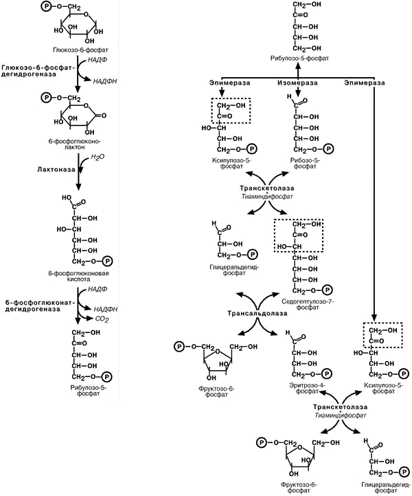 На первом, окислительном, этапе глюкозо-6-фосфат в трех реакциях превращается в рибулозо-5-фосфат, реакции сопровождаются восстановлением двух молекул НАДФ до НАДФН.