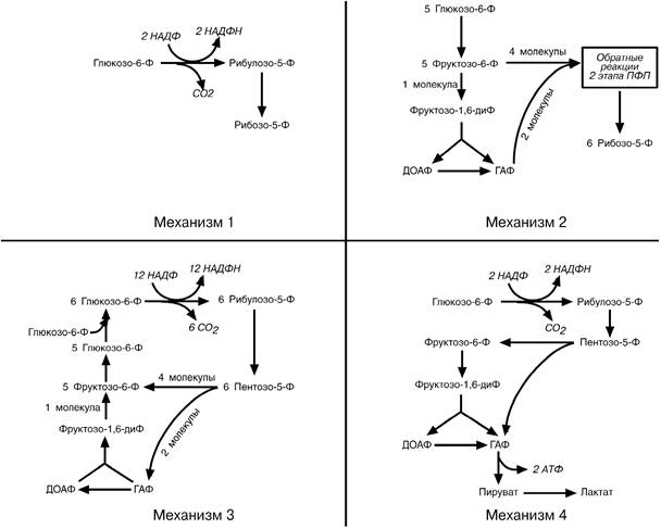 Механизм 4. Потребность в НАДФН значительно превышает потребность в рибозо-5-фосфате и необходима энергия (например. антиоксидантная защита в эритроците). Глюкозо-6-фосфат превращается в рибозо-5-фосфат и далее во фруктозо-6-фосфат и глицеральдегид-3-фосфат, которые (в отличие от механизма 3) вступают на гликолитический путь обмена, а не подвергаются обратному превращению в глюкозо-6-фосфат. Образованный пируват вступает в ЦТК. В результате происходит одновременное генерирование НАДФН и АТФ.