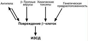 Более подробно рассмотрим 1 и 2 типы СД. Развитие ИЗСД обусловлено недостаточным синтезом инсулина в β‑клетках островков Лангерганса поджелудочной железы. Среди причин этого в настоящее время на первый план выдвигаются аутоиммунные поражения и инфицирование β‑тропными вирусами (вирусы Коксаки, Эпштейна-Бар, эпидемического паротита).